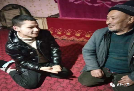 志愿者学生麦尔旦与疏附县乌帕尔镇拜西巴格村村民艾麦提·库尔班交谈。