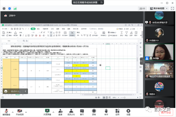 寒假期间,课题组成员扎实工作,认真调研,细致整理每日过程性材料。课题组定期召开工作推进会,对数据调研进展情况、存在的问题、下一步工作计划进行研讨交流;在此过程中,我校特聘教授、北京外国语大学夏登山教授和外国语学院“一带一路”外语翻译研究中心特聘研究员、西北工业大学林嘉新教授在问卷设计、数据整理、工作推进等方面给予了精准指导,给课题组工作的开展提出了宝贵的意见建议。