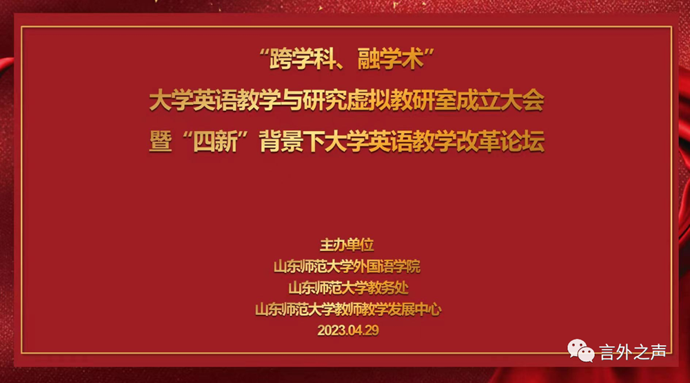 2023年4月29日,山东师范大学外国语学院举办“跨学科、融学术”大学英语教学与研究虚拟教研室成立大会暨“四新”背景下大学英语教学改革论坛,我院党委书记陈国静教授参与主持会议,公共外语教学部副主任陈盈盈就我校大学英语课程开设及教学改革情况进行交流发言,公共外语教学部全体教师参加线上论坛及院校交流活动。