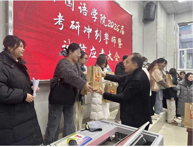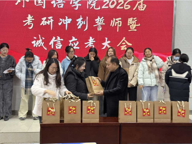 大会最后,学院领导与老师向129名考研学生逐一发放了“考研加油慰问礼包”,并组织现场师生代表合影留念。在主持人的祝福声中,大会圆满结束。