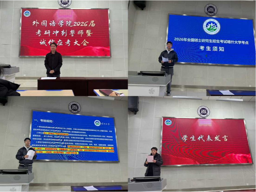 为进一步激发考研学子冲刺斗志,强化诚信应考意识,营造积极向上、风清气正的备考氛围,2025年12月10日晚,外国语学院在喀什大学隆重举行2026届考研冲刺誓师暨诚信应考大会。学院党委副书记、纪委书记阿力木江·买买提明,学工办主任努日比叶、副主任李岚钧、辅导员靳思佳、张妤萱、阿卜杜萨拉木·阿不都热衣木等教师代表以及129名2026届考研学生齐聚一堂,共同吹响决胜考研的冲锋号角。