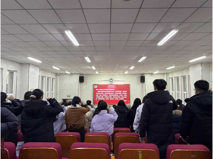 在激昂的氛围中,大会进入庄严的宣誓环节。全体129名考研学生在柯玉婕同学的带领下,高举右拳,以铿锵有力的声音郑重宣誓:“自觉遵守考试纪律,维护考试公平…恪守承诺,拒绝舞弊…为外院荣誉,为个人理想,拼搏到底,无悔青春!”誓言响彻会场,彰显了外院学子严守底线、奋力拼搏的坚定决心。