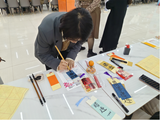 现场最具韵味的环节当属毛笔字书签创作,书桌之上笔墨纸砚一应俱全,师生们纷纷提笔挥毫,或书写节日祝福,或写下励志箴言,或临摹经典诗词、外语名句。一撇一捺间,尽显中华书法的独特魅力,一纸书签中,寄托着师生对传统文化的热爱与对未来的期许。大家手持亲手创作的书签,相互交流书写心得,在笔墨飘香中感受传统文化的浸润,让小小的书签成为联结师生情谊、传承文化根脉的美好载体。