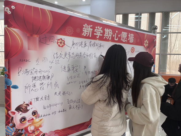 活动现场张灯结彩,处处洋溢着温馨喜庆的节日氛围。入口处精心设置的心愿墙成为一道亮眼的风景,心愿墙承载着同学们对新学期的美好期许,有人写下“练就过硬本领,深耕专业知识”的学习目标,有人期许“愿同窗皆进步,师生常相伴”的温暖愿景,还有人立志“用外语讲好中国故事”,一字一句皆是青春的憧憬,一笔一划尽藏前行的力量,心愿墙不仅定格了同学们的美好心愿,更凝聚起全院学子奋进向上的青春合力。