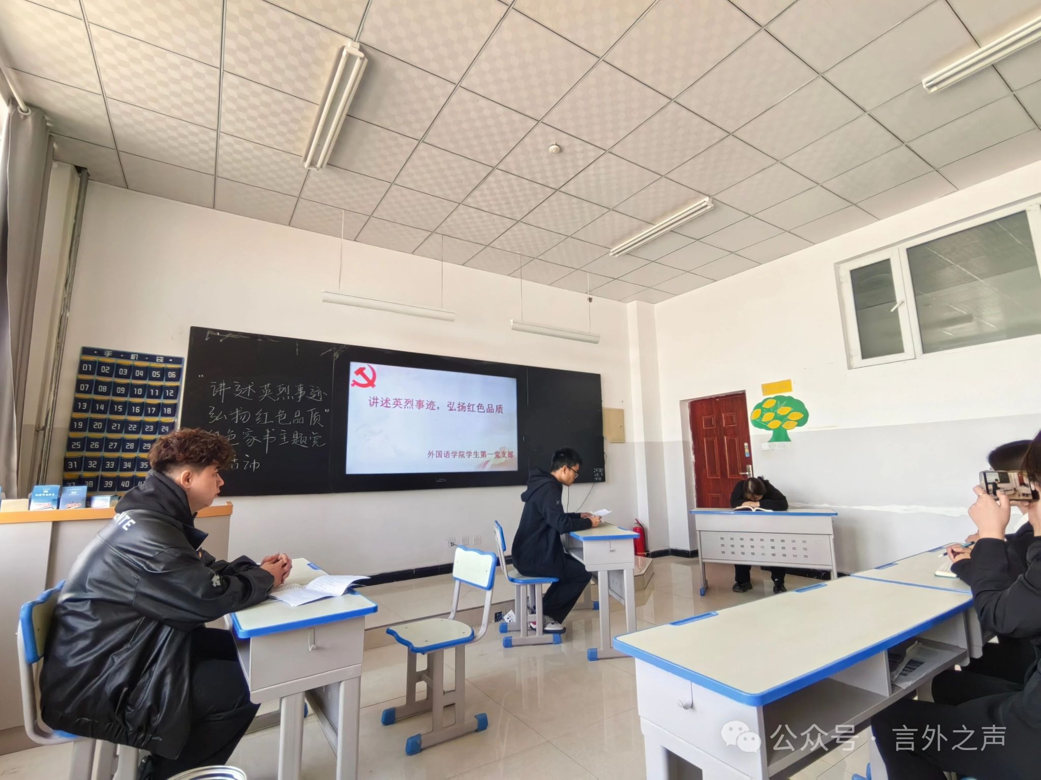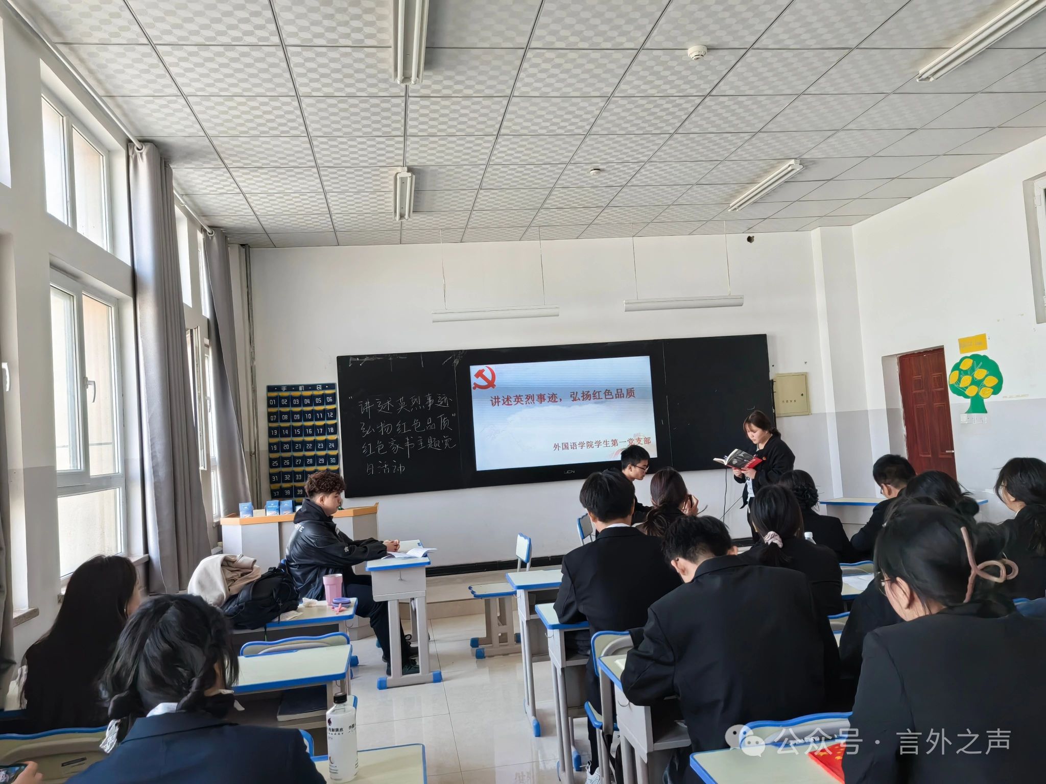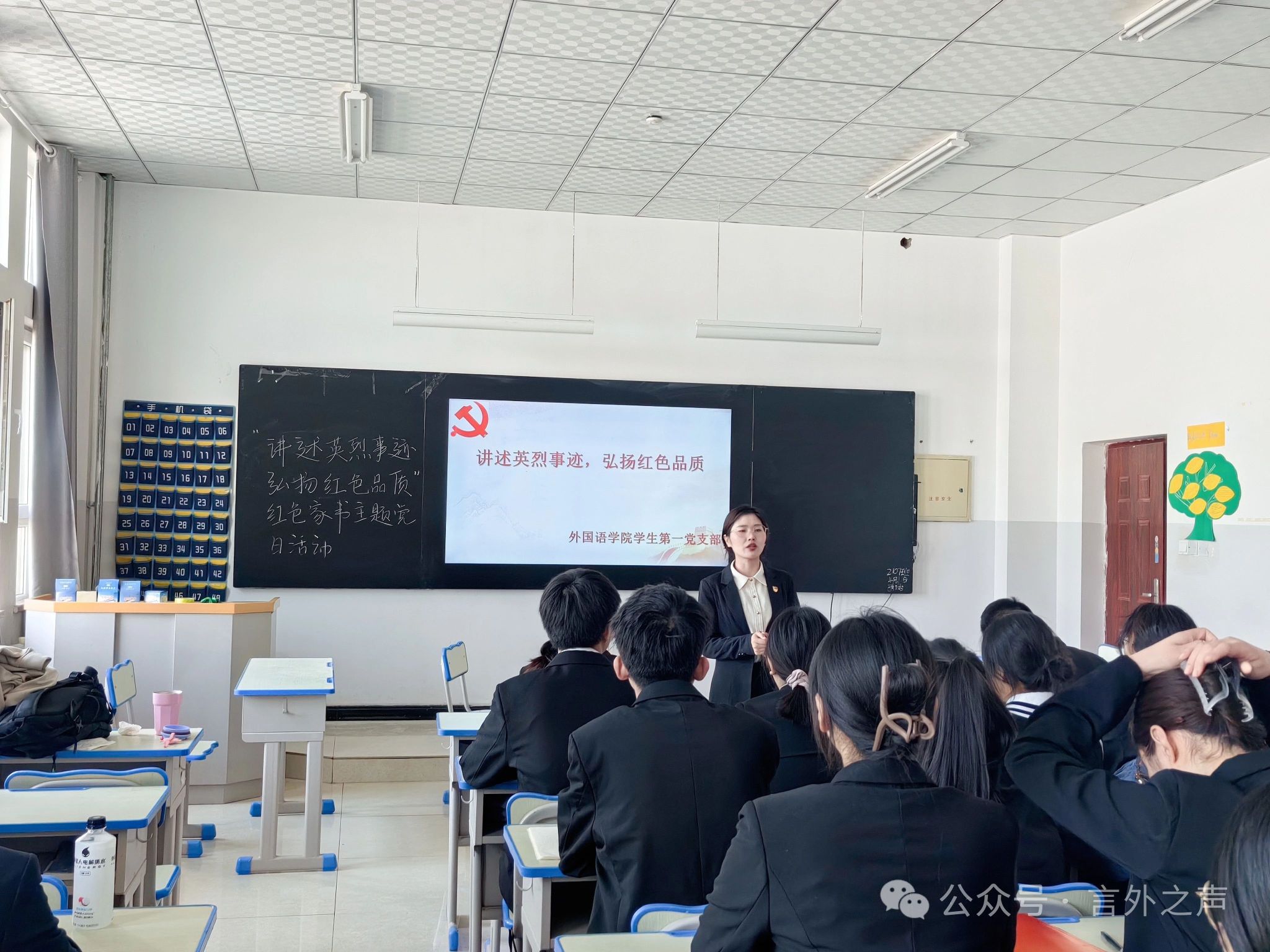 为深入贯彻落实“五个人人”工作要求,进一步引导我院学子传承红色基因、赓续红色血脉,厚植广大学生的家国情怀,4月4日,外国语学院学生第一党支部在学院C308教室开展“讲述英烈事迹,弘扬红色品质”红色家书主题党日活动,本次活动由支部书记王静静主持,全体党员参加。