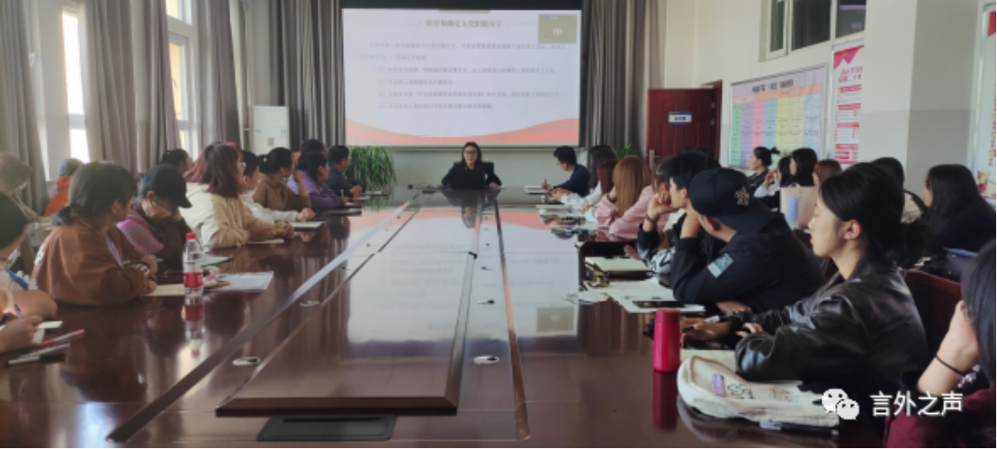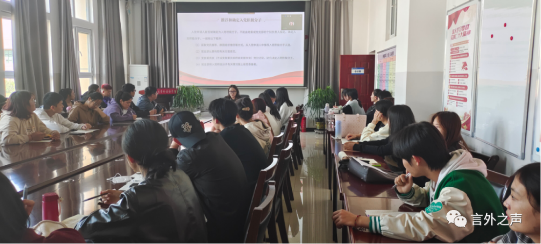 为深入贯彻落实习近平新时代中国特色社会主义思想,认真做好发展党员工作,10月14日,外国语学院党委于文科组团楼C220组织开展党课培训,主题为《中国共产党发展党员工作细则》解读。各党支部委员和第54期入党积极分子参加培训学习。