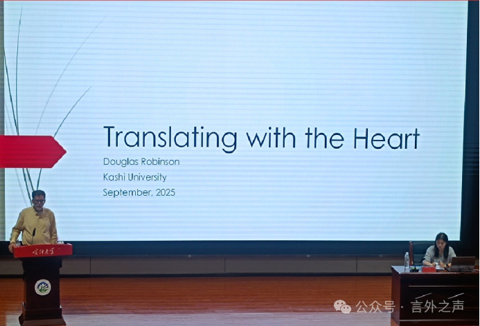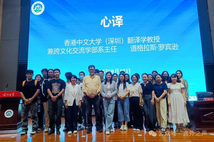 9月17日,我院邀请香港中文大学(深圳)翻译学教授兼跨文化交流学部系主任道格拉斯·罗宾逊开展了以《心译》为主题的学术讲座。本次讲座由学院党委委员、副院长舒进艳主持,学院部分教师、MTI研究生和23级、24级翻译专业本科生参加。