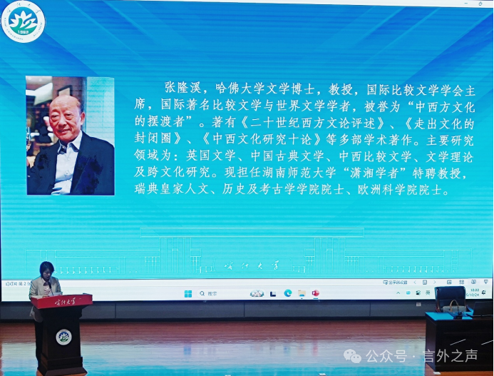 10月24日,我院邀请国际著名比较文学学者、哈佛大学文学博士、欧洲科学院院士、湖南师范大学“潇湘学者”特聘教授张隆溪教授开展了一场以“文学翻译、文化理解与世界文学”为主题的学术讲座。本次讲座由学院党委委员,副院长舒进艳主持,学院部分教师、MTI研究生和23级、24级英语和翻译专业本科生参加。