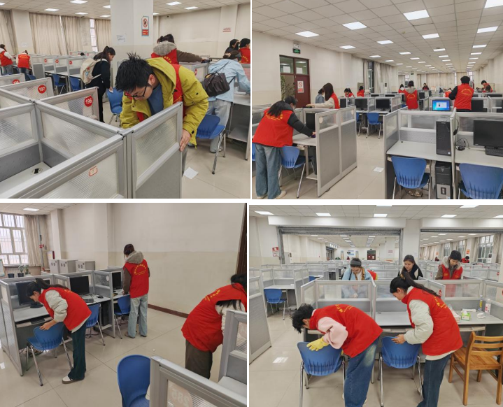 “书架这边再擦一下!”“地面的角落要仔细清理!”现场,志愿者们分工明确,干劲十足。他们手持抹布、扫帚等工具,化身“清洁卫士”和“整理能手”,对图书馆的桌椅、书架、门窗进行了细致入微的打扫。在大家的共同努力下,图书馆的每一层书架都一尘不染,每一扇窗户都光洁明亮,整个空间显得更加井然有序。
