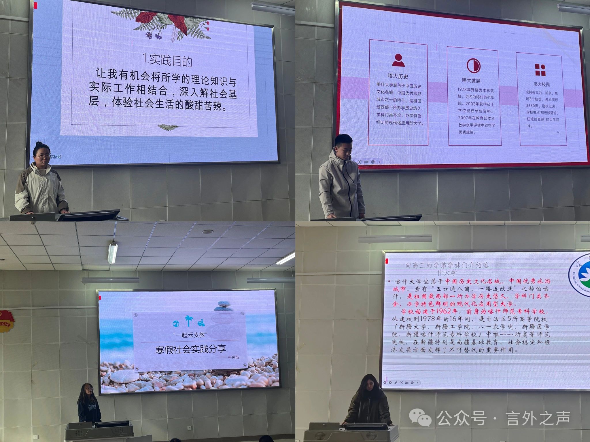 会议现场分享会上,来自2021、2022和2023级10位本科生分享了各自在寒假期间参加社会实践的经历和心得体会。2021级刘天一分享了假期留校在党办工作时的一些心得和感悟。2023级胡函赫、王雪婷、萨巴海提·塔西买买提、申思颖四位同学重返母校,向恩师致谢,为师弟师妹分享高考经验和大学生活,传授学习方法,答疑解惑,吸引更多学生报考我校,助力学校发展。2021级王新茹和2022级于家苗秉承“奉献、友爱、互助、进步”的志愿精神,通过线上线下相结合、“一对一结对陪伴”的方式,志愿者们带领中小学生开展了一系列丰富多彩的活动,向青少年传播中华优秀文化。2021级蒋锦镕和2022级刘晨旭分享了自己和团队成员一起深入社区、企业调研的经历。2022级赛那瓦尔·买买提在社区为孩子们上课,开展假期“红领巾小课堂”活动,引导小朋友们追求积极健康的假期学习生活。
