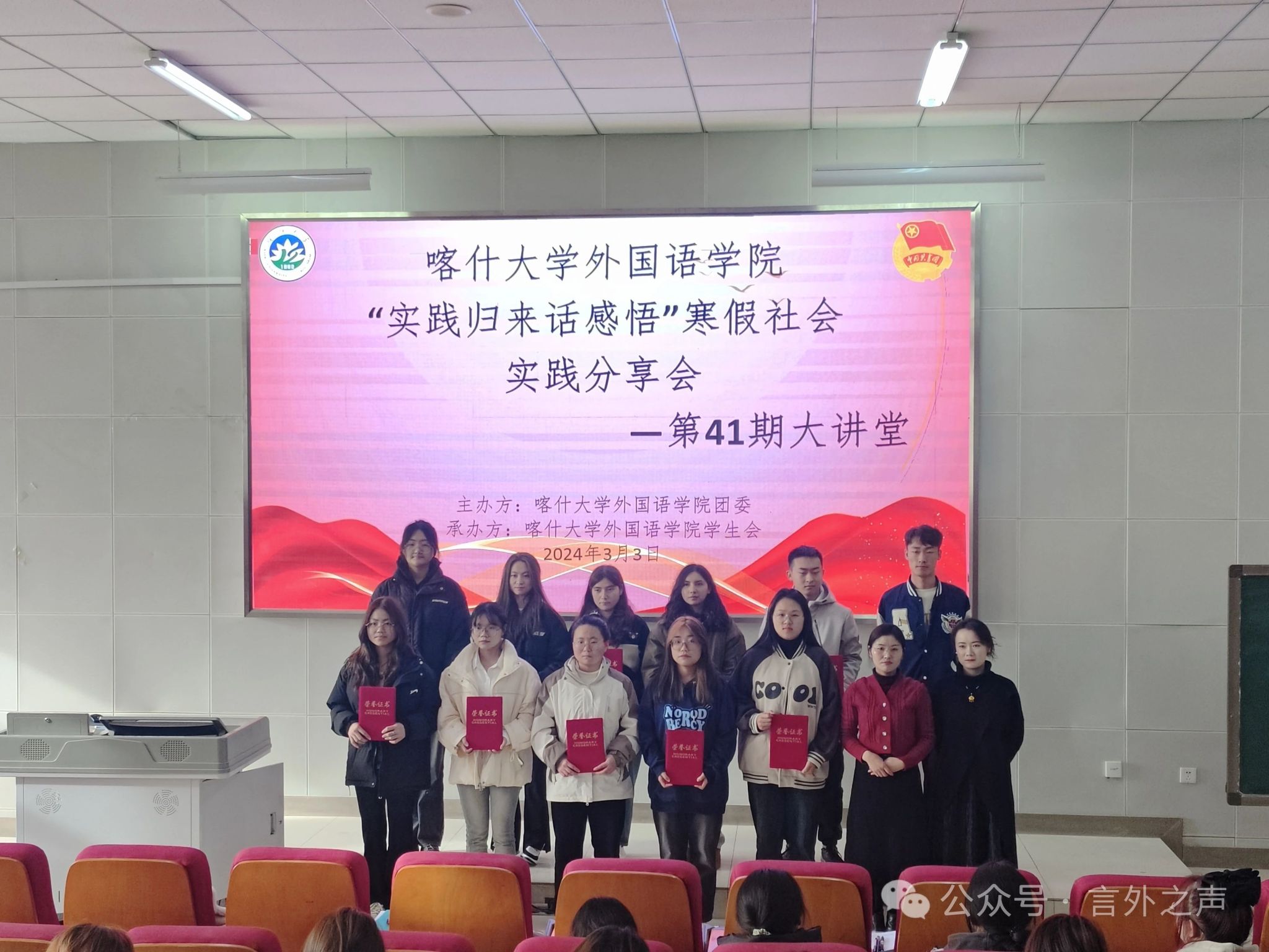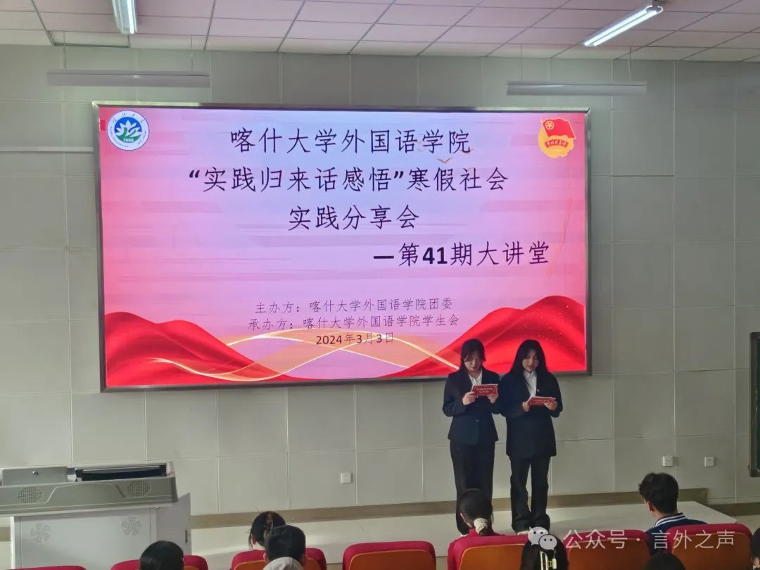 为进一步表彰先进、宣传典型,引导我院大学生更好地投入社会实践,促进社会实践工作长效化、项目化、阵地化、规范化发展,近日,我院团委于新文科组合楼D002报告厅举办了外国语学院第41期大讲堂——“实践归来话感悟”社会实践分享会,团干部、辅导员王静静、胡家俊、张妤萱、学生会部分成员及王新茹、赛那瓦尔·买买提、萨巴海提·塔西买买提、胡函赫等10名社会实践分享者参加了会议,本次会议由学生会干部娜迪热·买买提和孙利静主持。