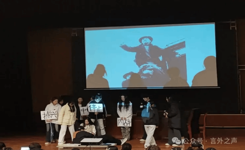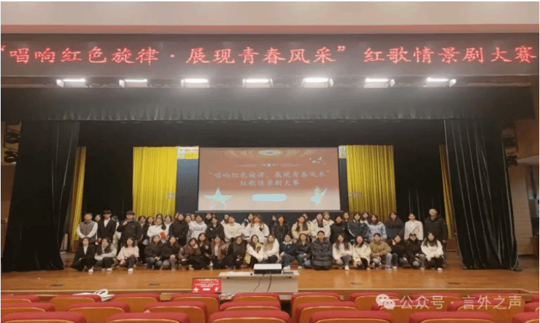 本次红歌情景剧以“一二·九”运动为背景,将历史故事与经典红歌巧妙融合。从学生们的精心筹备到舞台上的精彩呈现,生动展现了当年青年学子为了民族救亡图存而奋起抗争的壮丽场景。活动中学生们以低沉的音乐和朗诵引入,描绘出当时国家内忧外患、山河破碎的局面。随着剧情推进,激昂的歌声和富有感染力的表演,展现了青年学生们对帝国主义的侵略和国民党的卖国行径抗议。