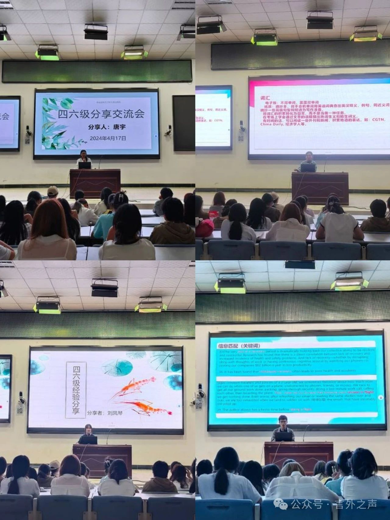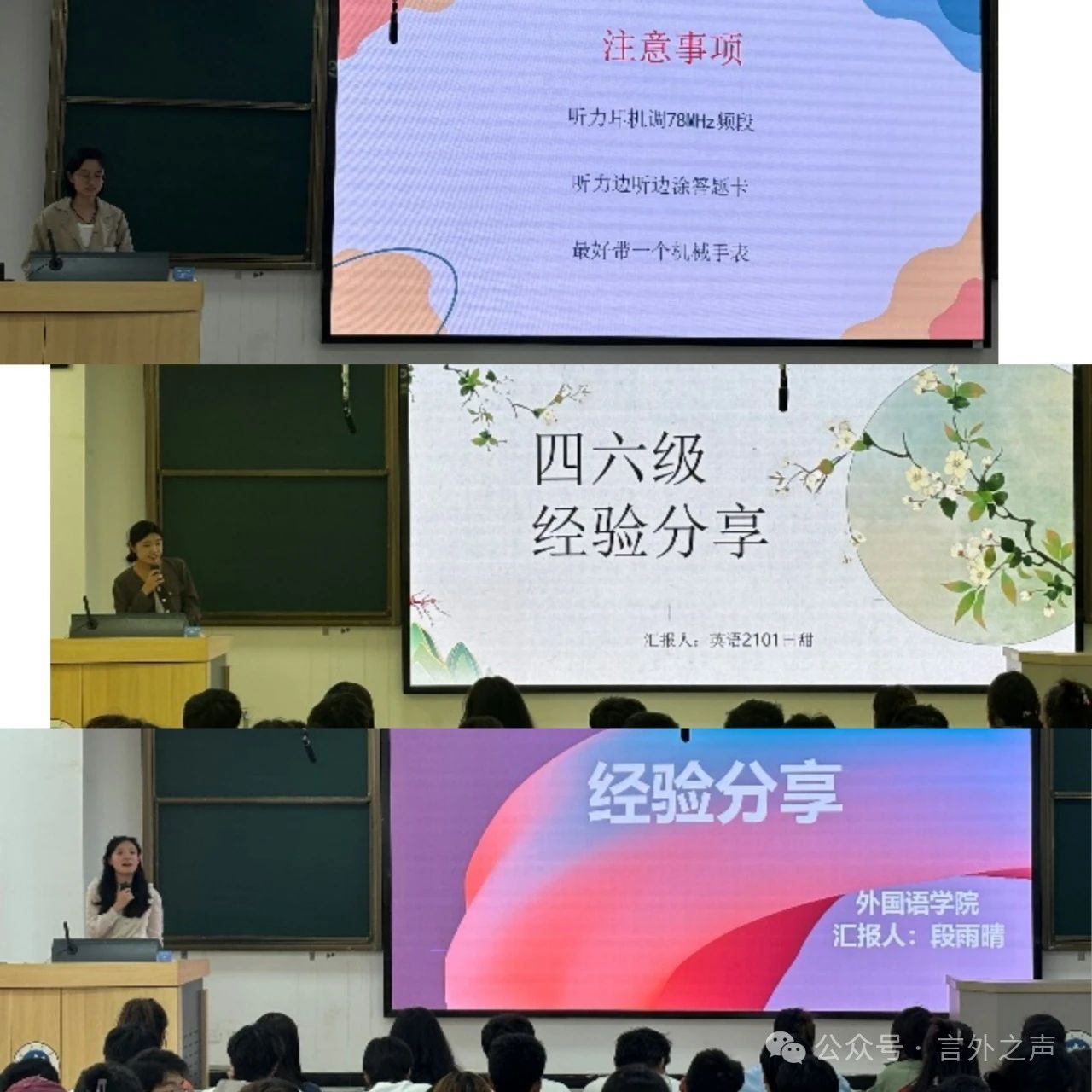 为帮助同学们充分了解四六级考试,掌握科学高效的学习方法,增强考试信心,提高备考效率,营造浓厚的英语学习氛围,2024年4月24日,外国语学院团委分别在新泉、高台、东城三个校区开展外国语学院第44期大讲堂—“同心共行,蓄势待发”四六级经验交流分享会,此次会议由邓雅妮、令狐妮、武斯宇任主持,我院唐宇、李静、陈志恒等15名分享者代表和三个校区300余名学生参加。