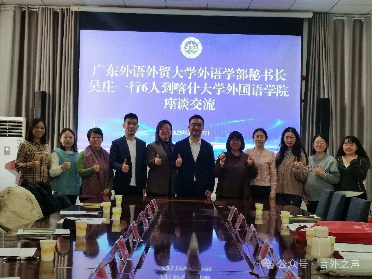 为落实校级对口支援协议,深化校际合作,11月17日,广东外语外贸大学外语学部秘书长吴庄一行6人赴喀什大学外国语学院开展交流调研。喀什大学外国语学院党委副书记、院长范姣兰及各系部负责人热情接待并座谈。